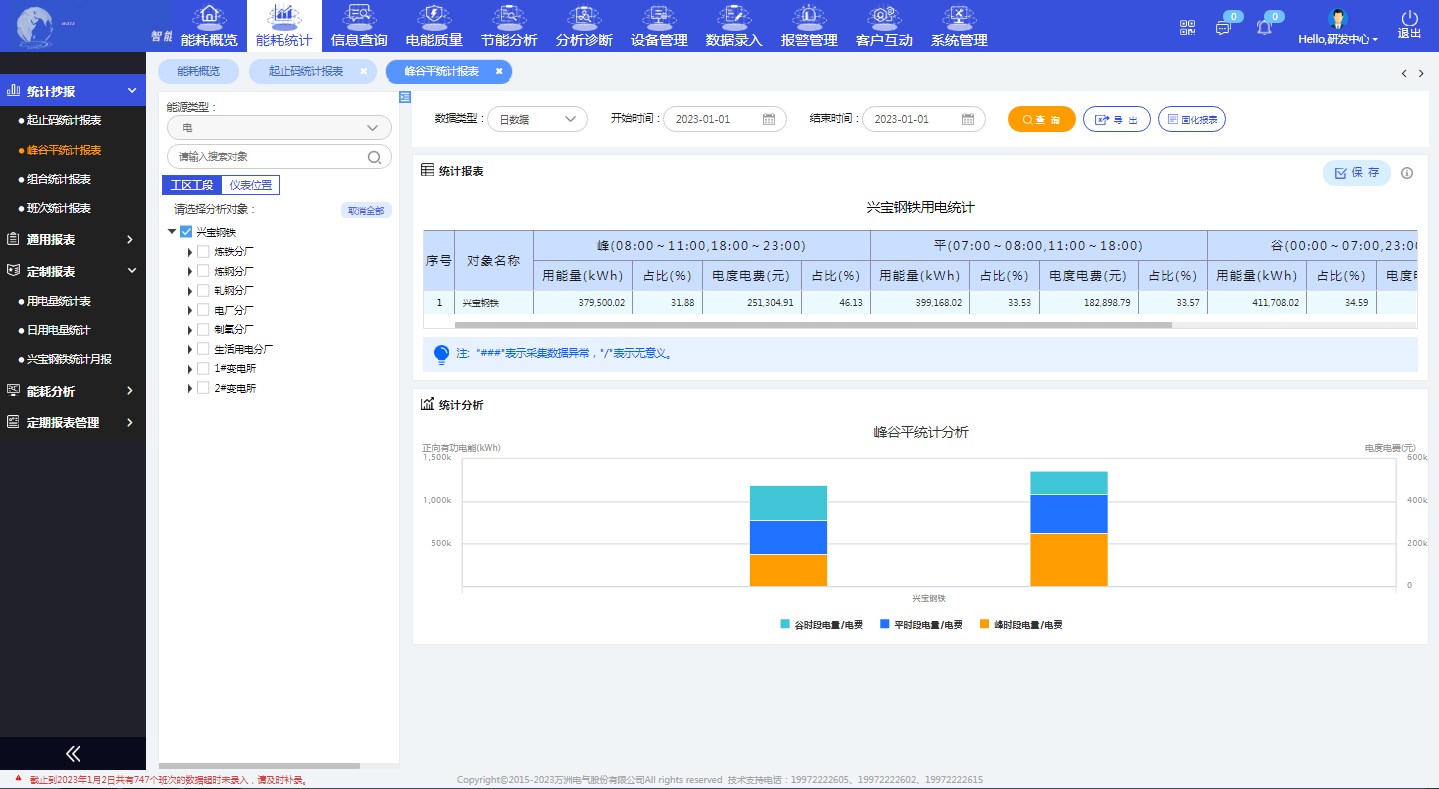 能耗统计功能主要是实现现场能源的自动抄报,可解决该钢铁公司手工抄表的问题。其中报表分为通用报表和我司为该钢铁公司专门开发的定制报表,提升了该钢铁公司自动化、信息化程度,减少工作人员工作量,节约人力成本,提高工作效率和准确率。