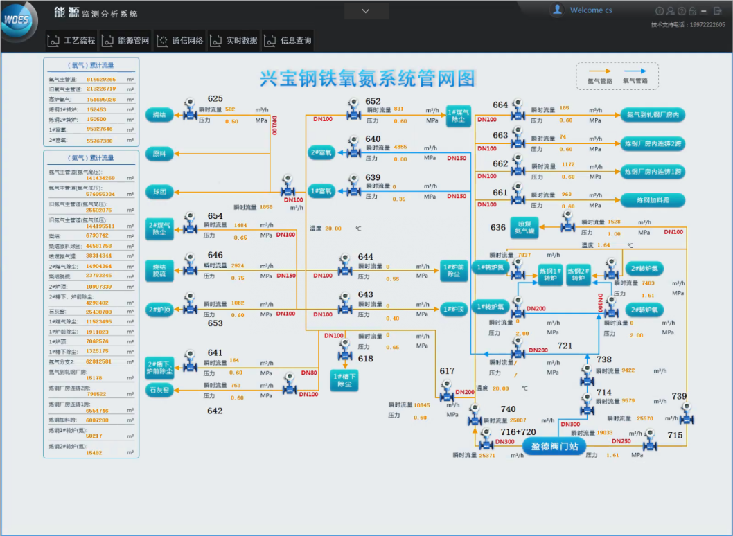 山西省某钢铁有限责任公司WOES智能优化节能系统监测能源种类为电力、水、蒸气、煤气,监测点共计411个,其中电力监测点338个、水系统监测点44个、蒸汽和煤气、氮气、氧气监测点52个。涵盖炼铁厂(石灰窑工段、喷煤工段、球团工段、烧结工段、高炉炼铁工段)、炼钢厂、轧钢厂、制氧厂、发电厂、煤气柜。项目主要建设内容如下: