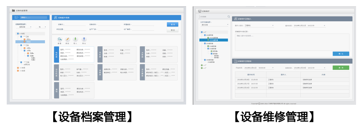 ①将全厂重点设备按工段、工序、车间、配电室等属性进行合理的分类管理,为企业建立健全的电子设备档案,并关联记录设备实际运行中的用能数据,为企业计算设备单耗、工序能耗提供数据基础。