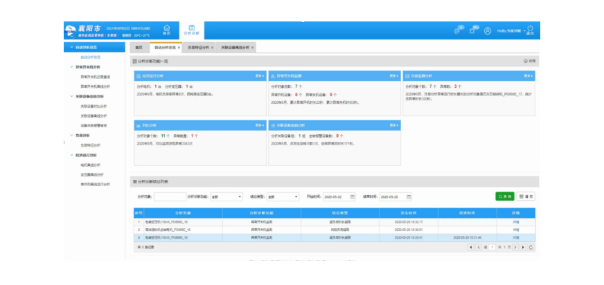 包括分析诊断总览、负荷分析、异常开关机分析、经济运行分析、对比分析、关联设备联锁分析6个功能模块,对采集的用能单位能耗、生产、设备运行等数据进行自动分析诊断,能够及时定位能效、能耗、安全异常点,提高能源利用效率,降低生产运营成本。