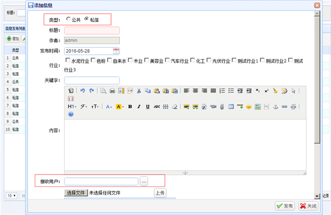 节能服务公司和企业用户沟通的桥梁,通信的方式有两种,第一种可以发布公共信息,即所有帐号都可以收到并查看该信息;第二种可以发送私信给某个帐号或多个帐号,只有选择的作为接收人的帐号才能接收和查看该信息。企业信息跟踪功能主要是为远程平台执守人员日常工作需要开发的功能。